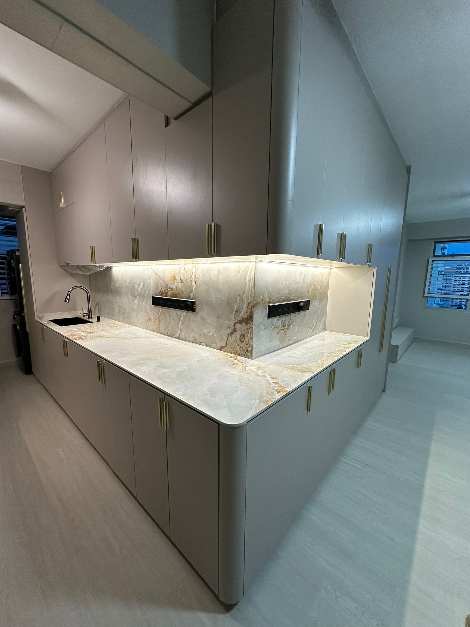 Complete kitchen transformation along with dining space redesign for improved flow and modern aesthetics.
